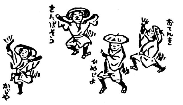 この踊りは、大名行列供奴(ともやっこ)のしぐさや木屋瀬で日常みられる色々な仕草を取り入れて、掛け声「イサ、アトセイッ、ソッ」に合わせて踊り始めたのが木屋瀬宿場踊りの始まりです。